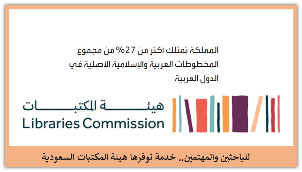 وفرت هيئة المكتبات السعودية خدمة “إتاحة المخطوطات” على موقعها الإلكتروني الرسمي، حيث يعد هذا المشروع نوعيًا على مستوى العالم، وستُتيح الهيئة من خلاله المخطوطات لعموم المتصفحين والباحثين والمهتمين بهذا المجال، وذلك حرصًا من هيئة المكتبات السعودية على دعم الوصول الحر للمعلومات، من خلال الرابط الإلكتروني: https://libraries.moc.gov.sa/ar/manuscripts
